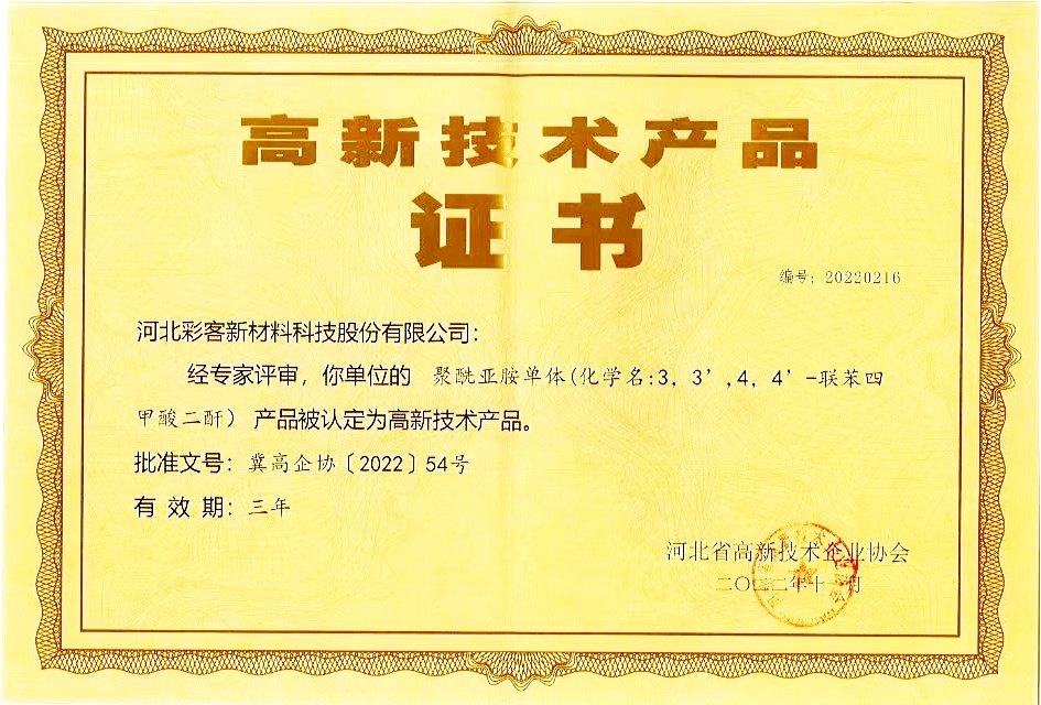 河北彩客新材料科技股份有限公司是一家專注于高性能精細化工產品研發(fā)、生產及銷售的高新技術企業,主要產品為高性能有機顏料中間體(DMSS、DATA、DMS、DIPS)、食品添加劑中間體 DMAS、新材料聚合單體 BPDA 等。